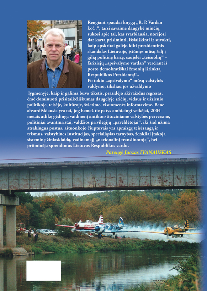 Rengiant spaudai knygą „R. P. Vardan ko?..“, tarsi savaime daugybė minčių sukosi apie tai, kas svarbiausia, norėjosi dar kartą prisiminti, išsiaiškinti ir suvokti, kaip apskritai galėjo kilti prezidentinis skandalas Lietuvoje, įstūmęs mūsų šalį į gilią politinę krizę, saujelei „teisuolių“-fariziejų „apsivalymo vardan“ verčiant iš posto demokratiškai žmonių išrinktą Respublikos Prezidentą?!..